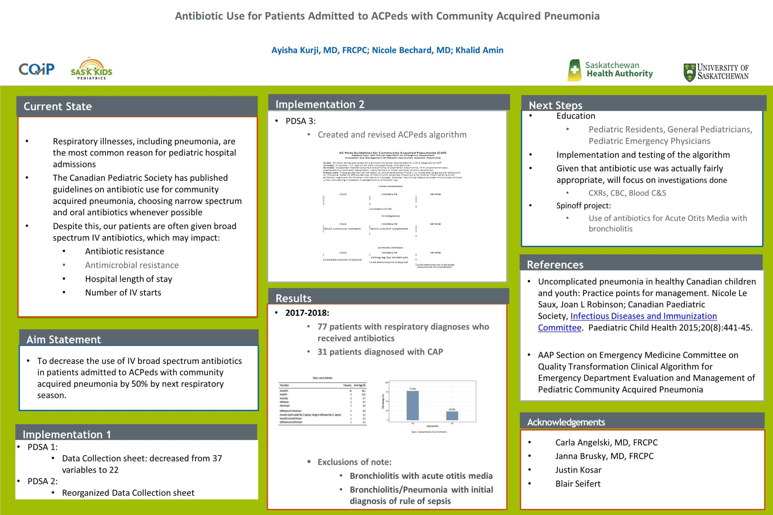 For her CQIP project, Dr. Kurji aimed to decrease the use of IV broad spectrum antibiotics in patients admitted to ACPeds with community acquired pneumonia by 50% by next respiratory season. Read her poster to learn more.