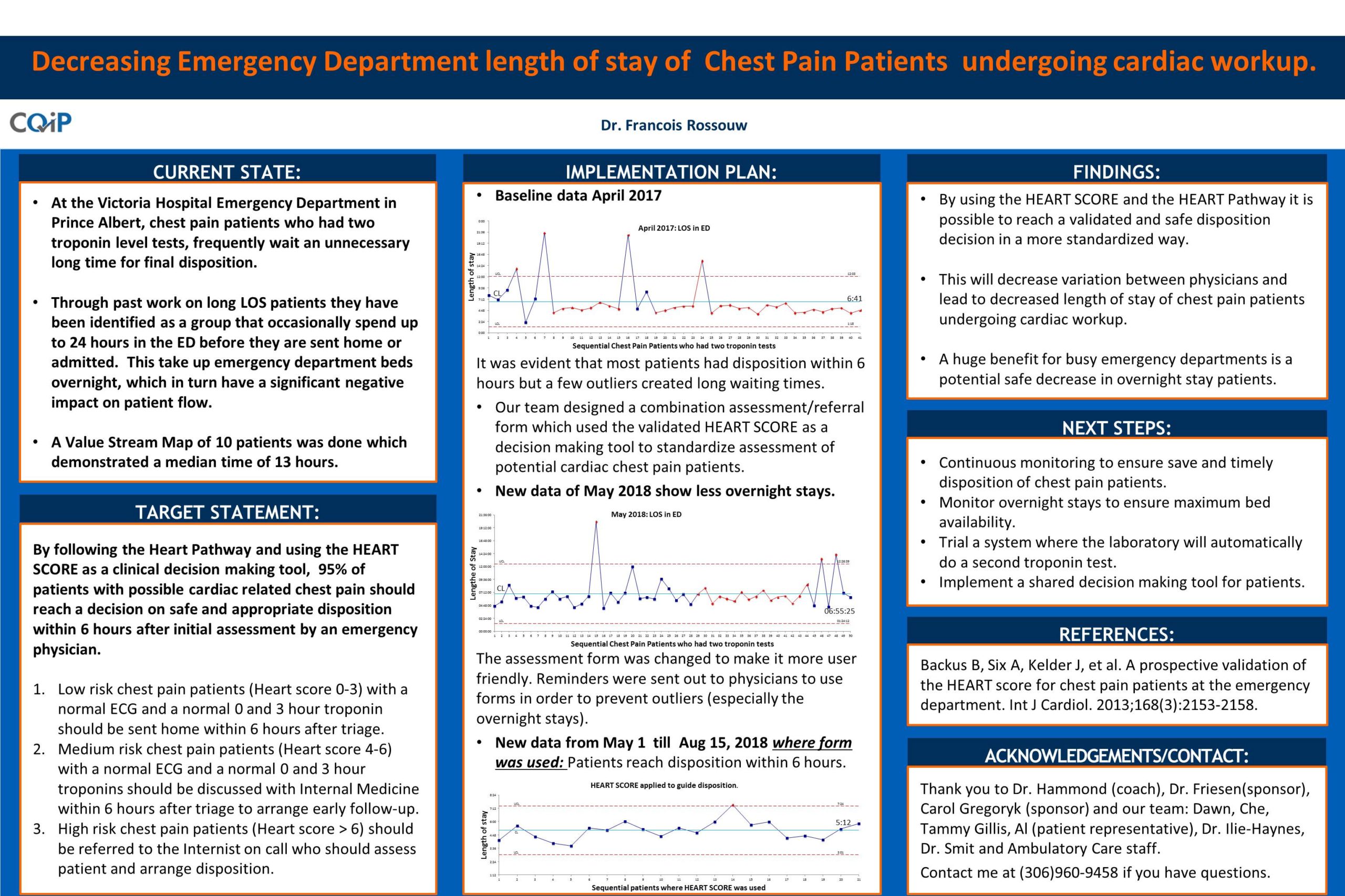 For his CQIP project, Dr. Rossouw aimed to follow the Heart Pathway and using the HEART SCORE as a clinical decision making tool so that 95% of patients with possible cardiac related chest pain should reach a decision on safe and appropriate disposition within 6 hours after initial assessment by an emergency physician. Read his poster to learn more.