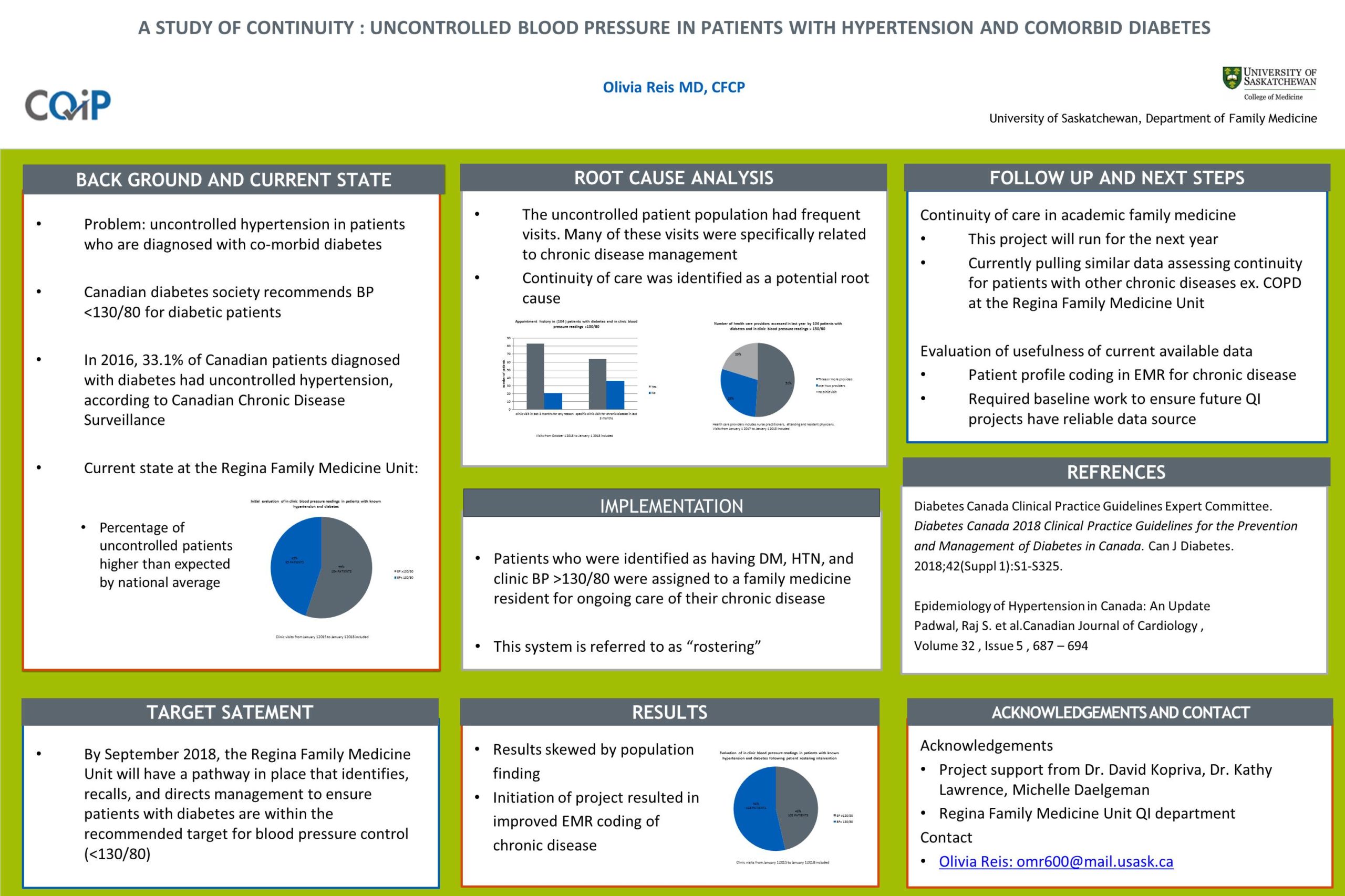 For her CQIP project, Dr. Reis aimed to set a pathway in place at the Regina Family Medicine Unit that identifies, recalls, and directs management to ensure patients with diabetes are within the recommended target for blood pressure control (<130/80) by September 2018. Read her poster to learn more.