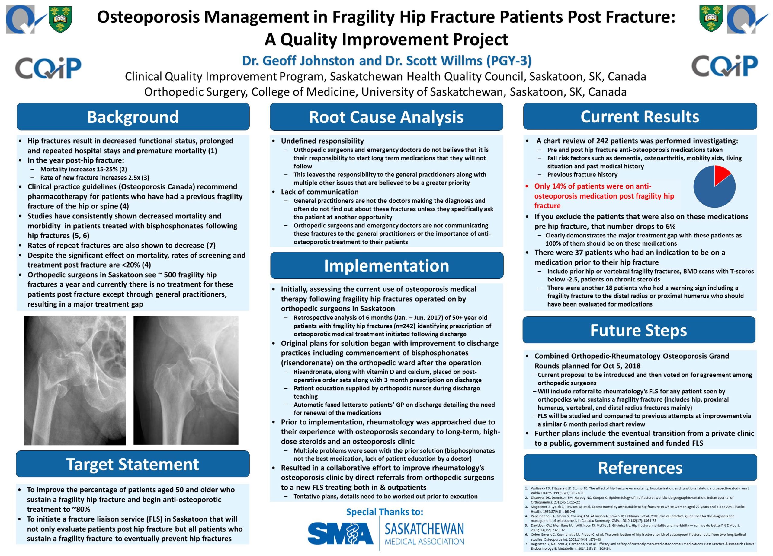 For his CQIP project, Dr. Willms aimed to improve the percentage of patients aged 50 and older who sustain a fragility hip fracture and begin anti-osteoporotic treatment to ~80% and initiate a fracture liaison service (FLS) in Saskatoon that will not only evaluate patients post hip fracture but all patients who sustain a fragility fracture to eventually prevent hip fractures. Read his poster to learn more.
