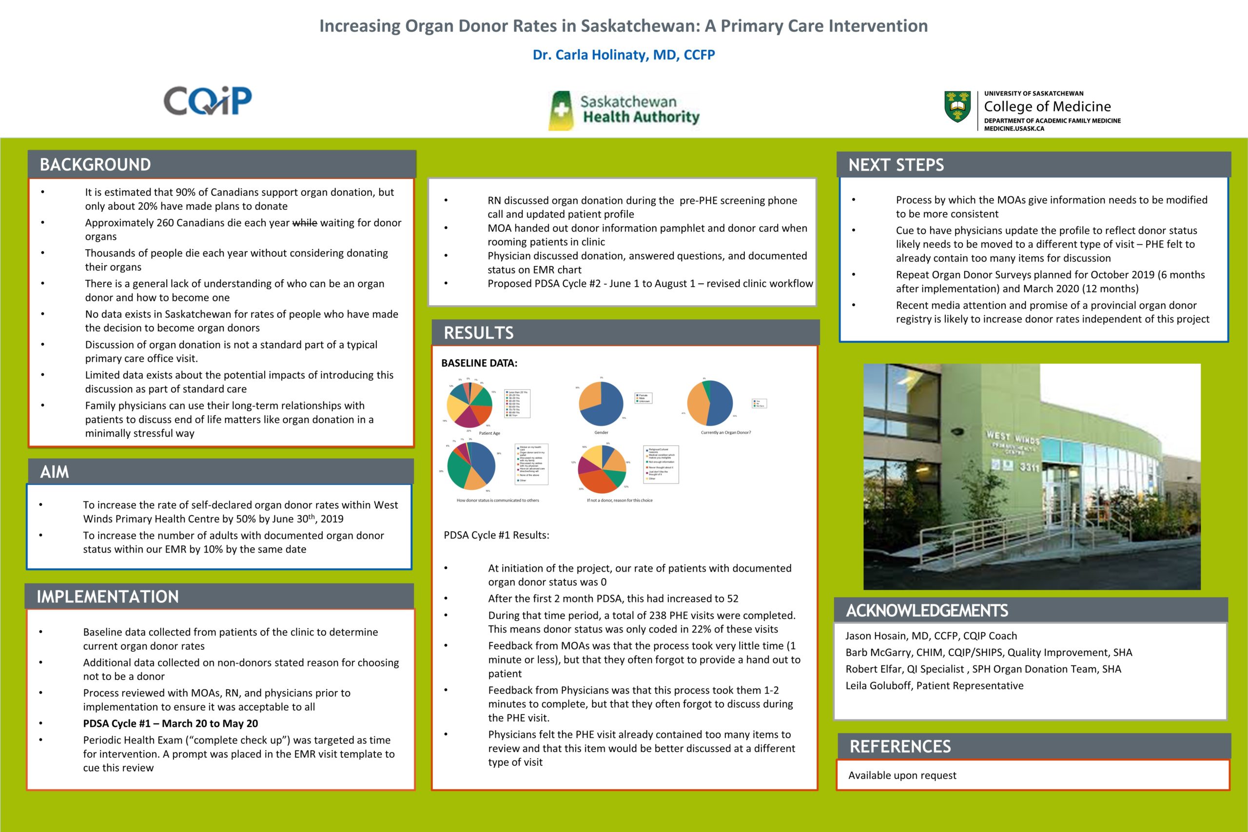 Research for Dr. Holinaty’s CQIP project was done in a family practice setting and looked at trying to increase organ donor rates through physician-patient conversations at the clinic. For the first cycle, Dr. Holinaty’s clinic went from zero patients with coded donor status to 52 (22%) in a two-month period. For the second cycle, the RN at the clinic included it as part of her pre-screening call and the conversation with a physician will be moved to a different visit type.