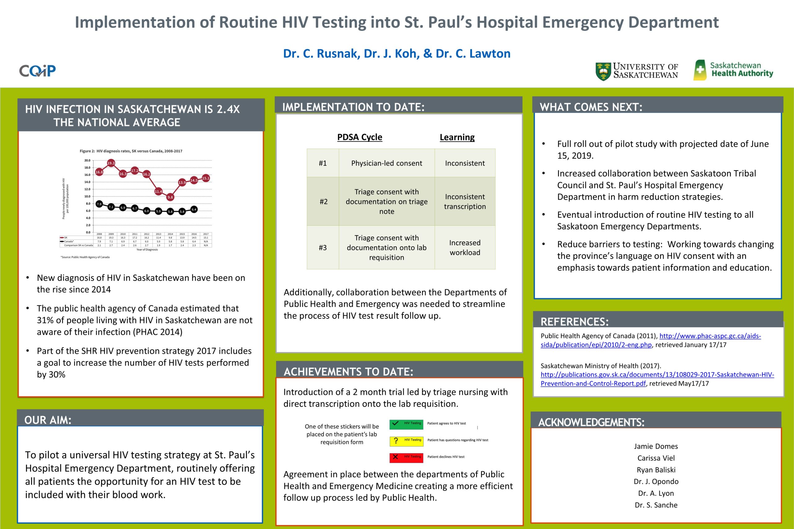 With HIV being a problem in Saskatchewan, Dr. Rusnak chose to focus his CQIP project on changing the culture around HIV testing in the emergency department. To do this, his team created an opt-out system for HIV testing for patients visiting the emergency department who requiring bloodwork. Through this process, the current physician-led testing and follow up model was replaced with a more collaborative, nursing-led process that involved resources from emergency medicine, public health, biochemistry and infectious diseases.