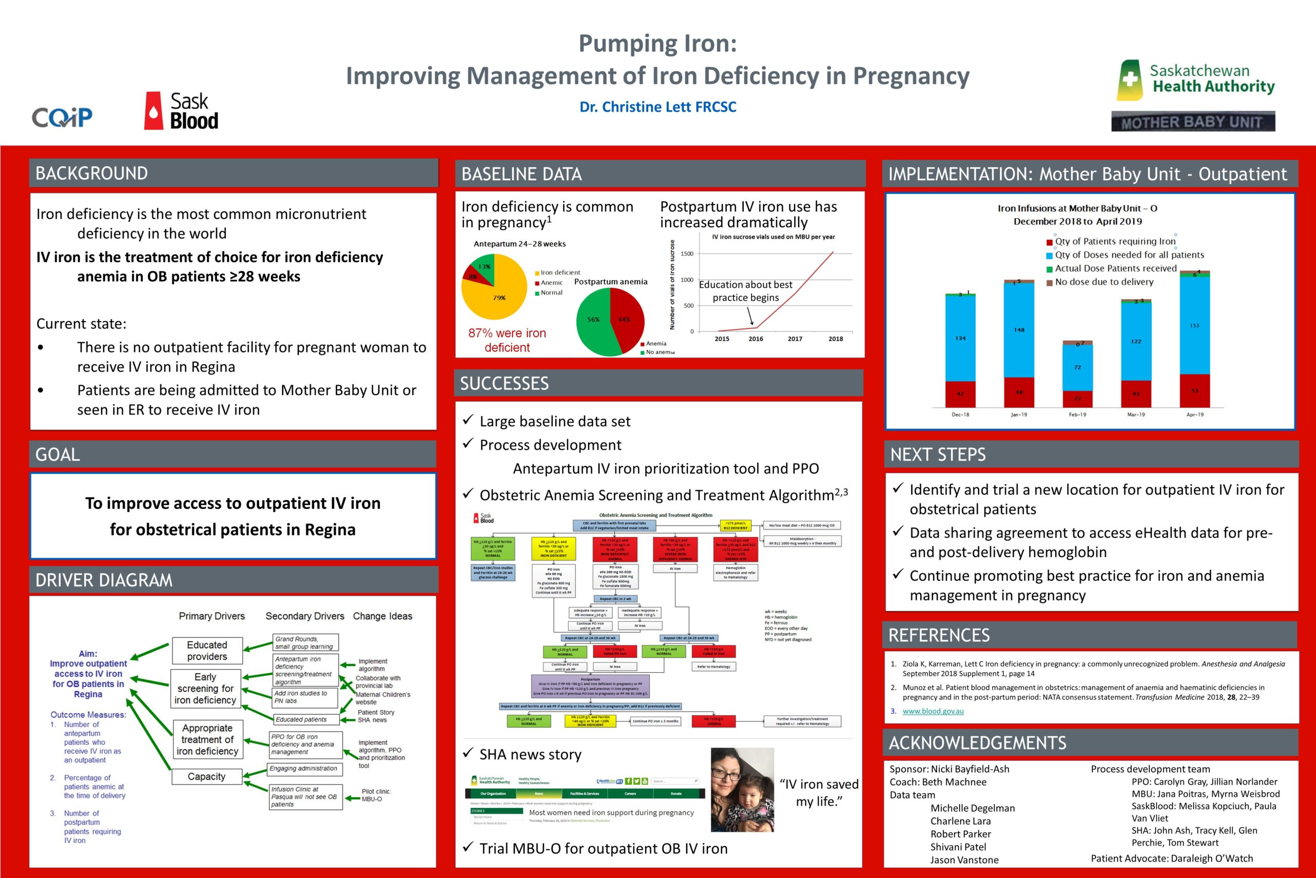 After doing a retrospective chart review of 280 patients in her practice, Dr. Lett was shocked to discover that 87% of her pregnant patients were iron deficient between 24 and 28 weeks and 44% were anemic in that cohort. For her CQIP project, Dr. Lett created screening and treatment algorithms for iron deficiency and anemia in pregnancy. The aim of the project was to improve access to IV iron for pregnant women in Regina.