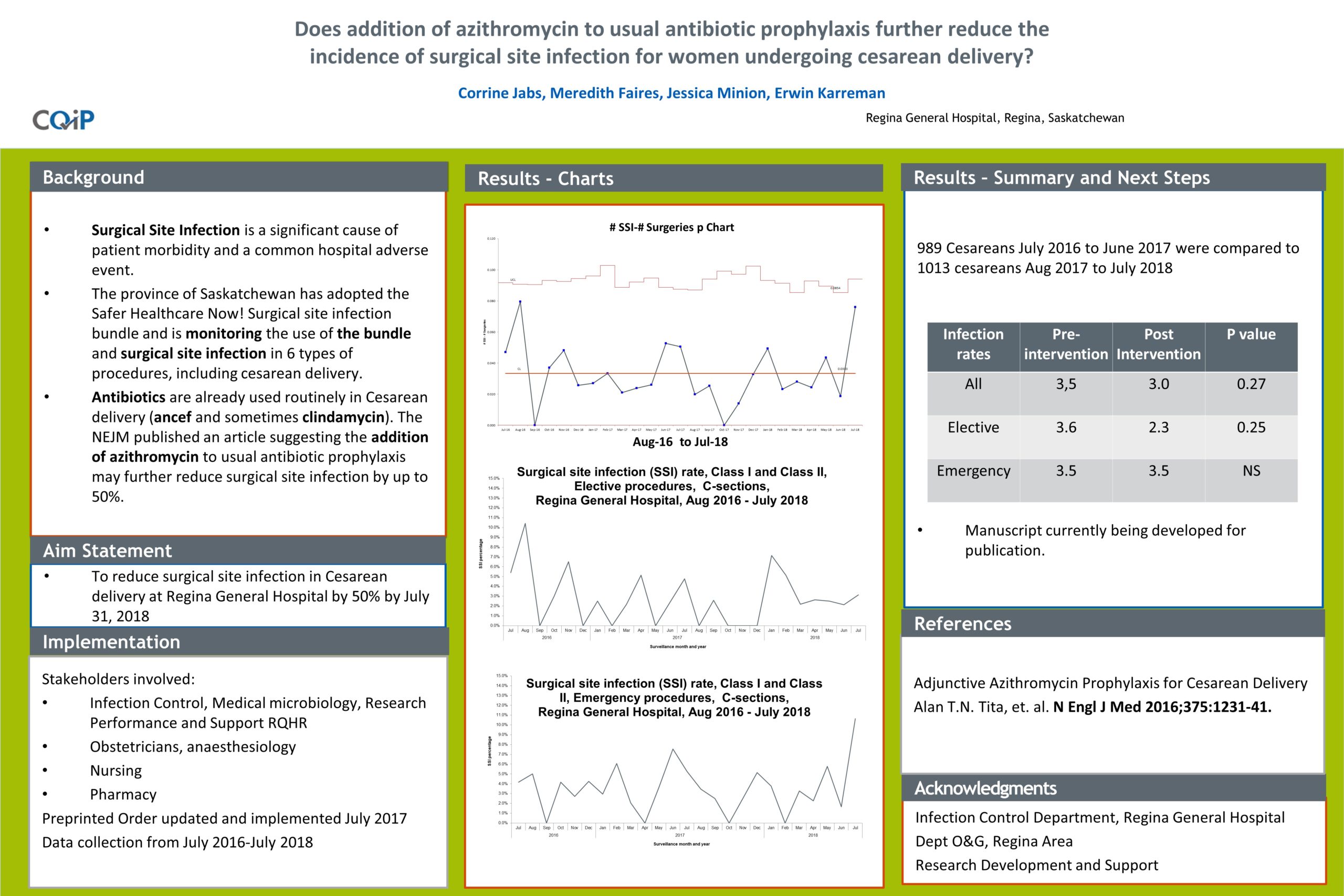 As a means of decreasing infection rates in Caesarean deliveries, Dr. Jabs led a CQIP project that saw azithromycin added to the usual mix used for prophylaxis. With 95% compliance in administering the drug, infection rates dropped 0.5% to 3% throughout the course of the project. The project found that the implementation of addition of azithromycin to usual antibiotic prophylaxis did not reduce surgical site infection in women undergoing cesarean delivery?