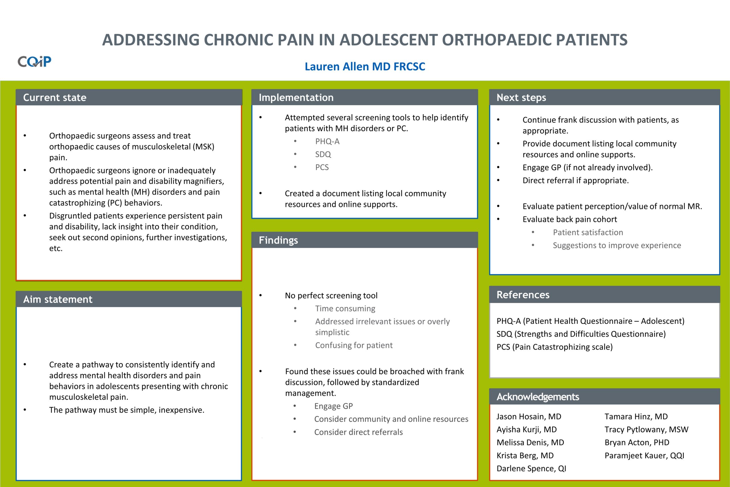 The goal of Dr. Allen’s CQIP project was to create a pathway that identified and addressed mental health disorders and pain behaviours that are known to magnify musculoskeletal pain in adolescents. Several screens were trialed, with variable success, but Dr. Allen found that open discussion tailored to each patient, engagement of the family physician, and sharing contact information for community and online resources was a simple way to address teens presenting with chronic pain.