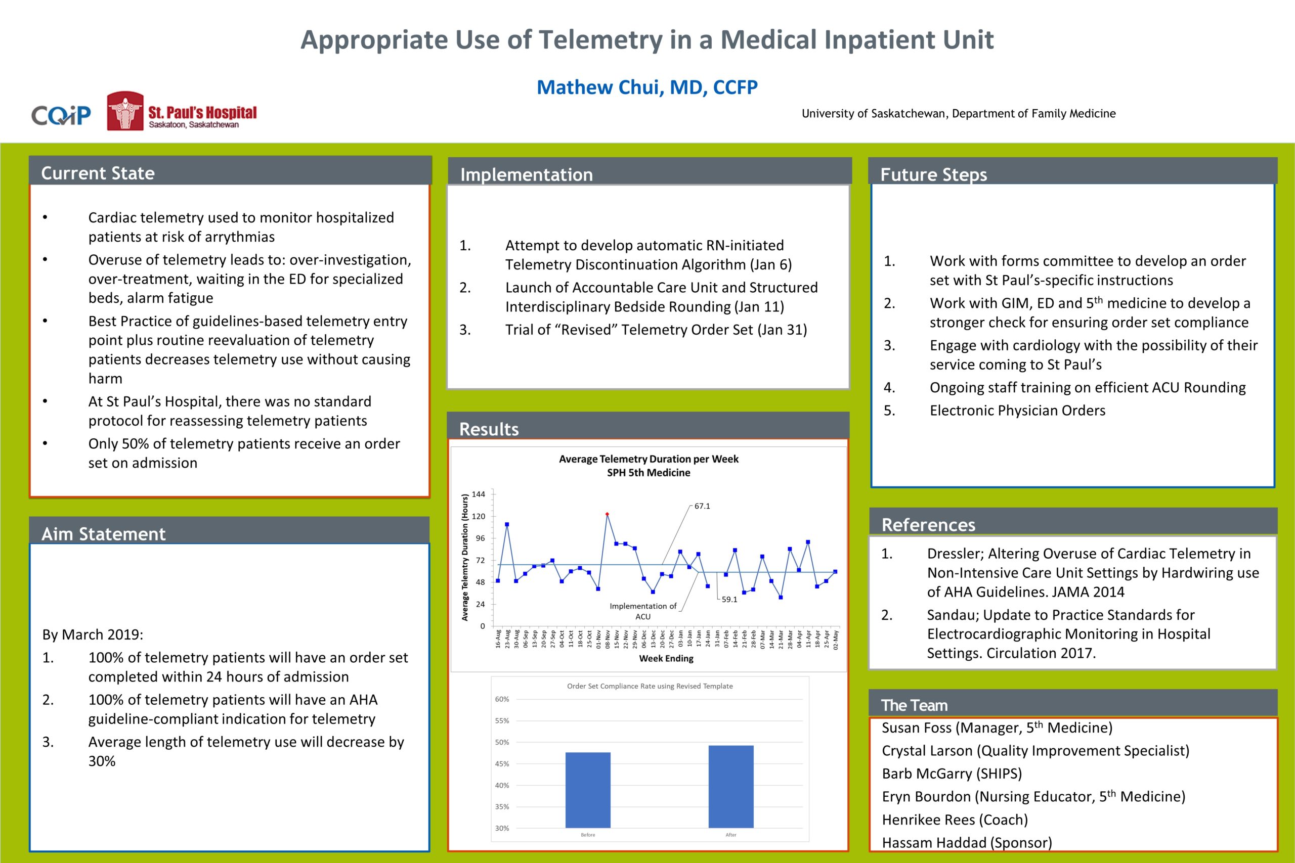 Dr. Chui looked at improving the telemetry order admissions set to decrease unnecessary use of this expensive technology for his CQIP project. This process was created collaboratively and was implemented and structured into interdisciplinary bedside rounds. While there didn’t seem to be a change in the compliance of the order set, initial results suggested a 12% decrease in the average telemetry duration for patients.